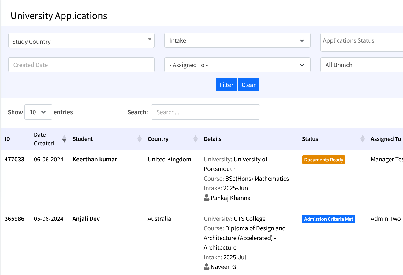 Our CRM makes it a breeze to view and manage overseas university applications using several custom filters like application id, student name, study country, course or application status.