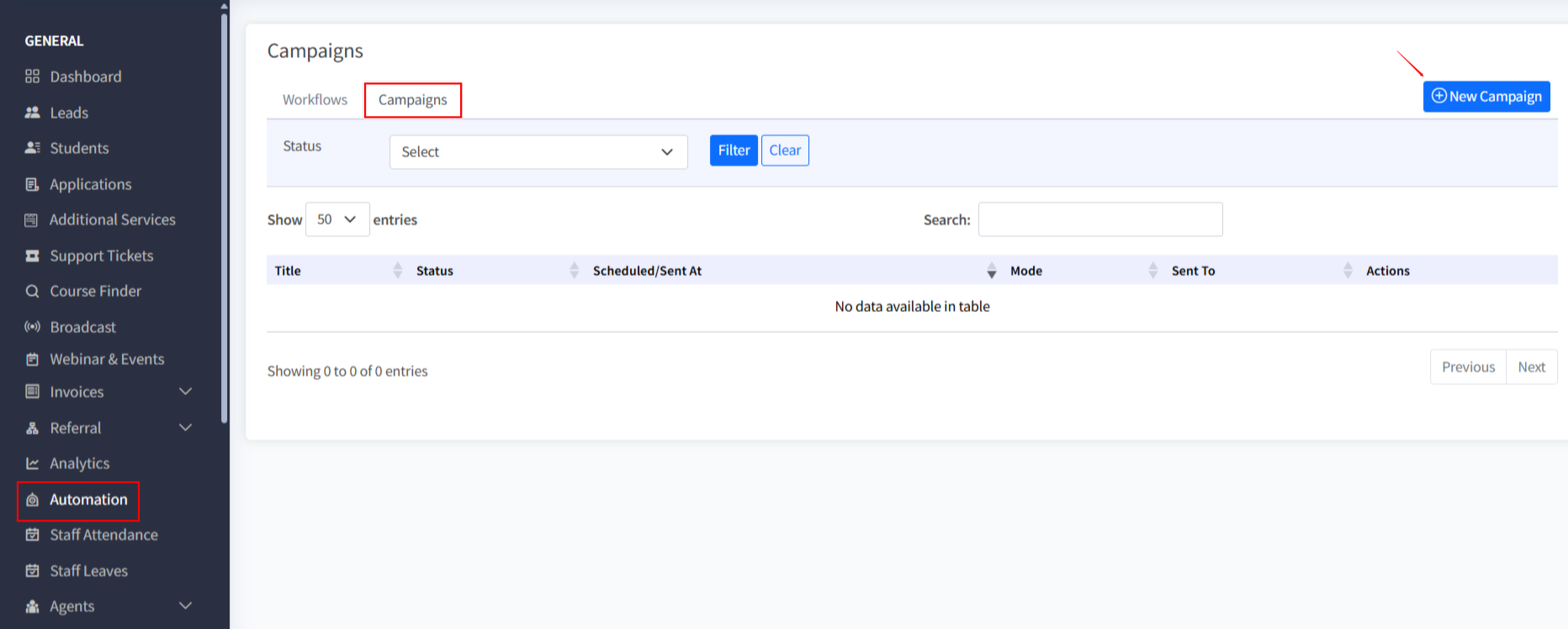 - Click + New Campaign to start creating a new email campaign.