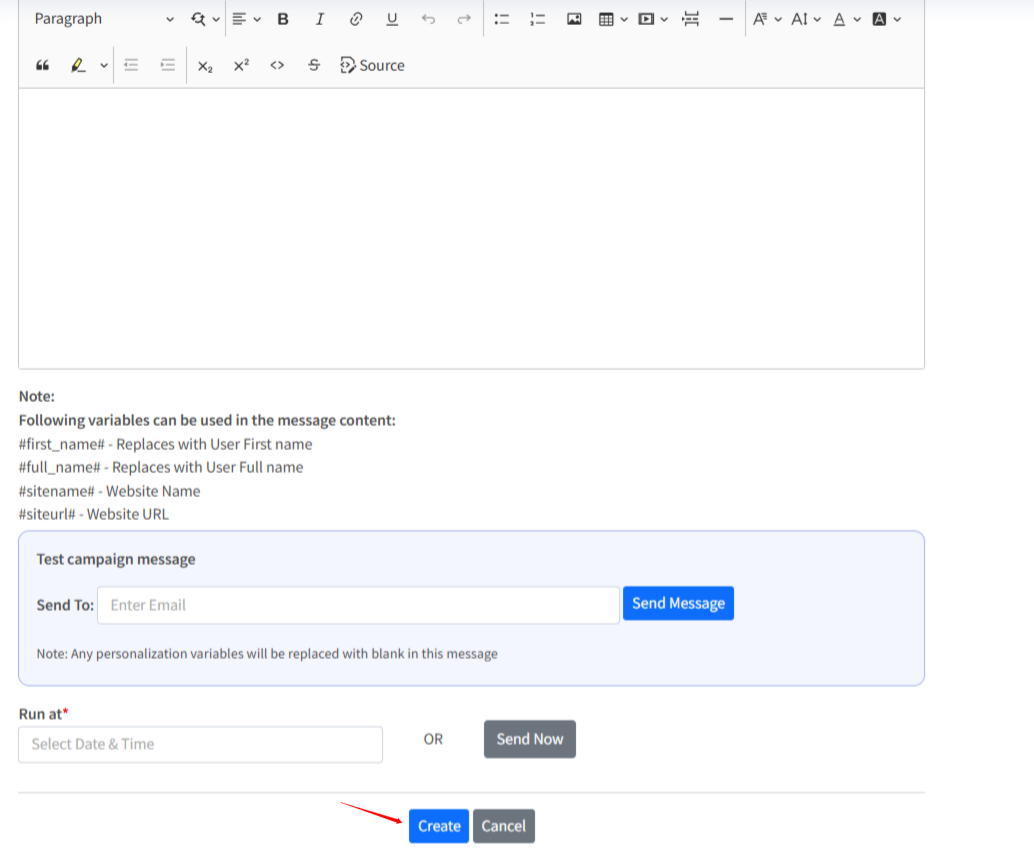 - Choose between Send to dispatch the campaign immediately or Create to save it for later sending.