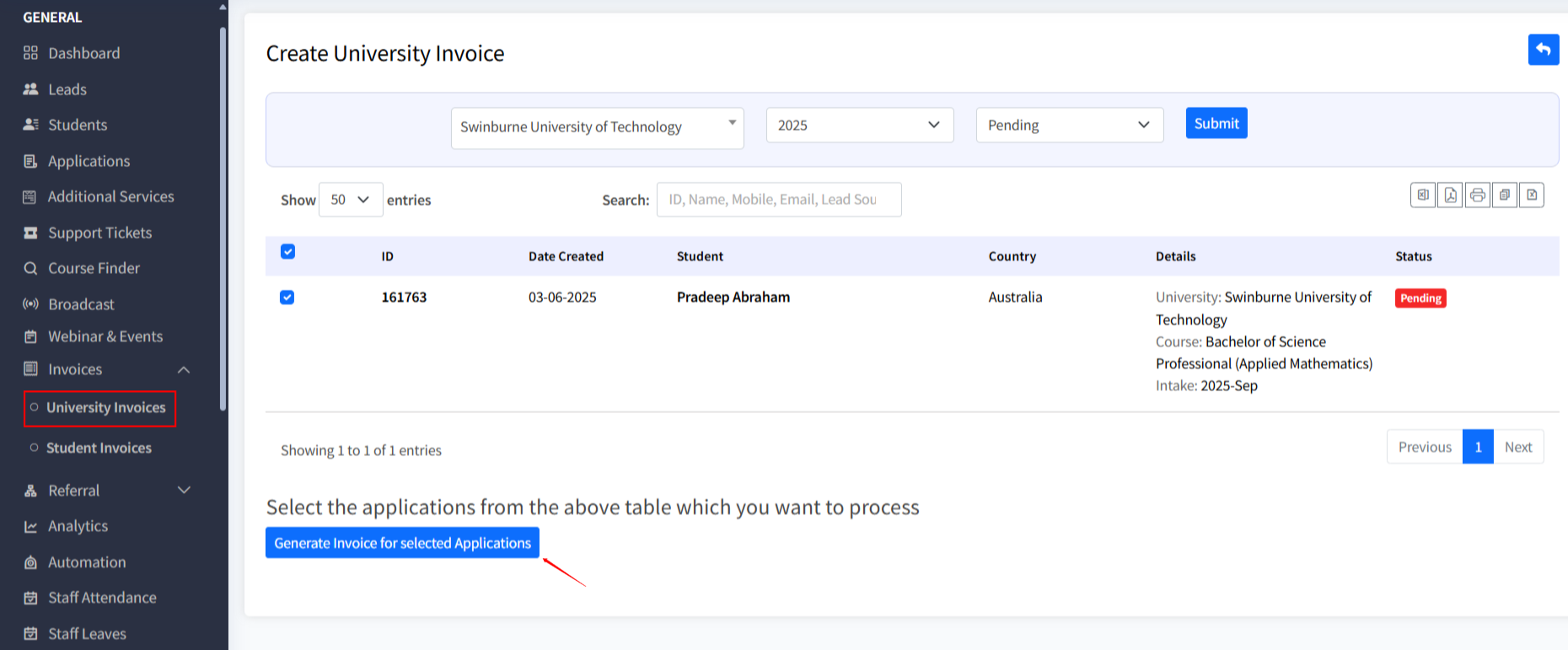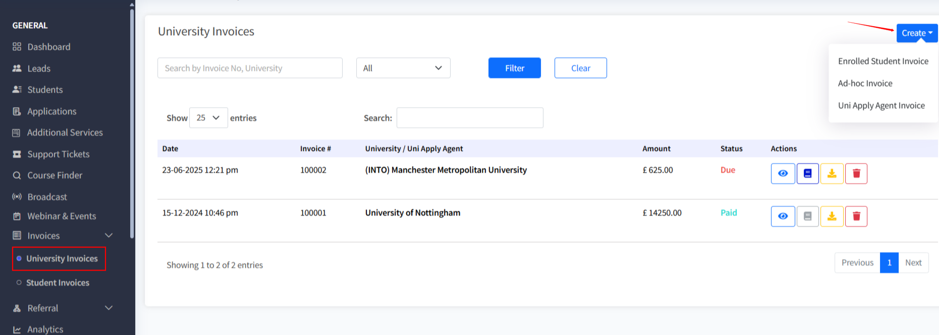 Learn how to create and manage different types of university-related invoices in EduCtrl CRM, including Enrolled Student Invoices, Ad-hoc Invoices, and UniApply Agent Invoices.