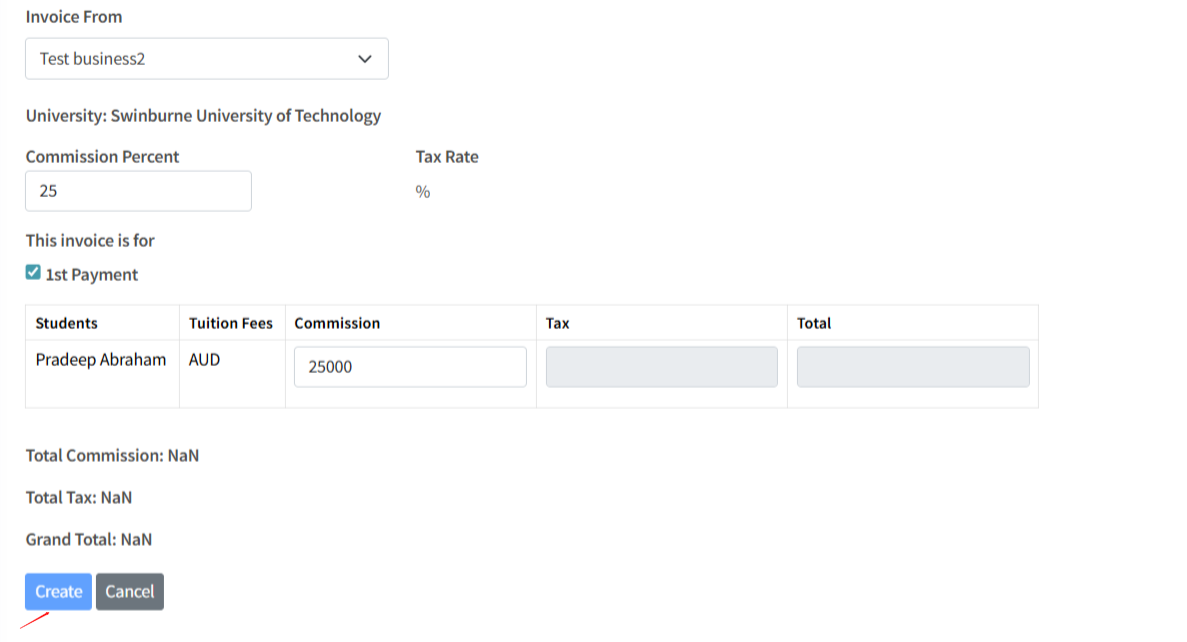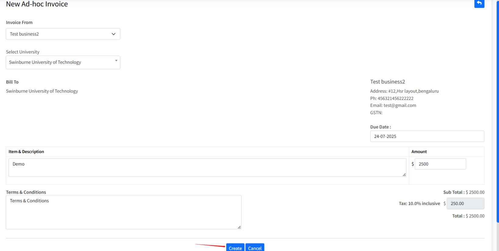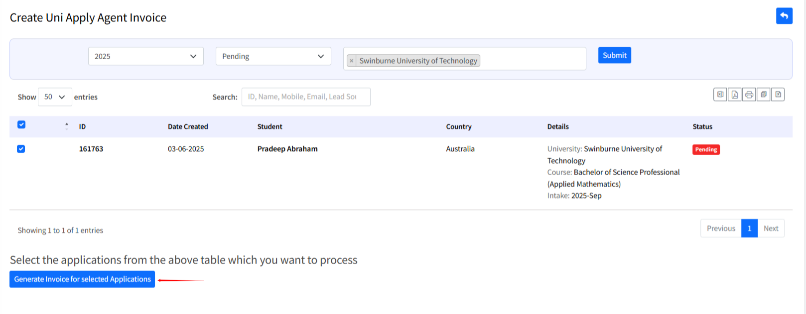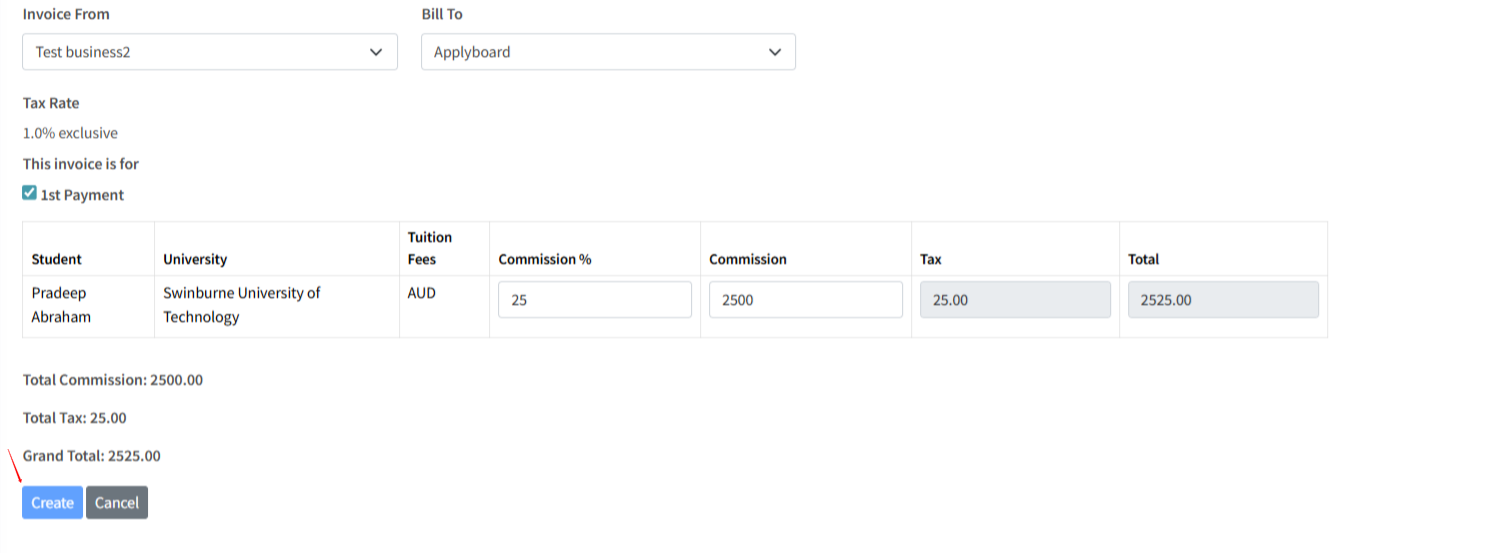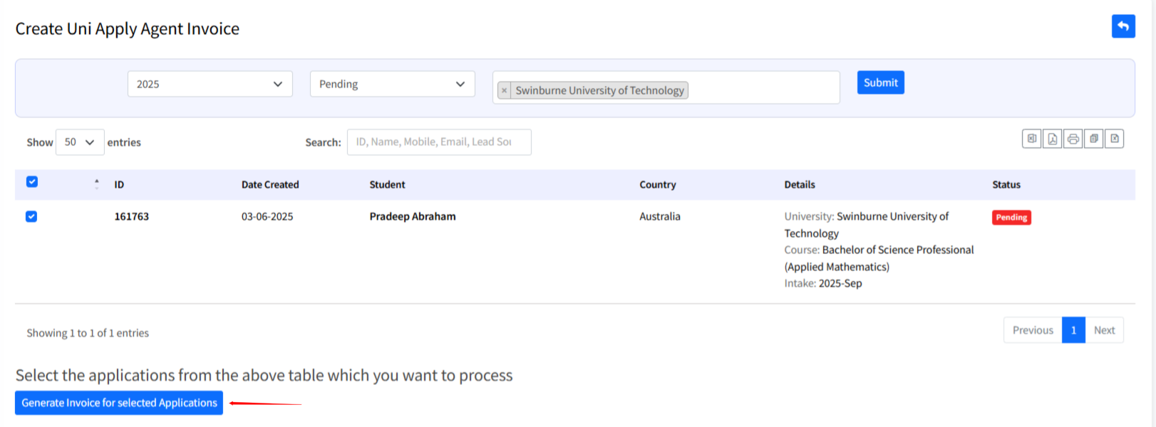 The agent will now appear in the Bill To dropdown while creating UniApply Agent Invoices.