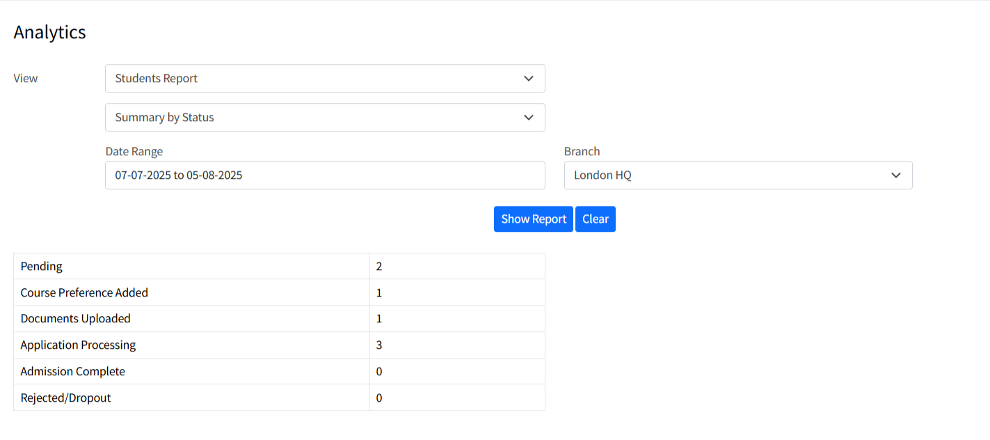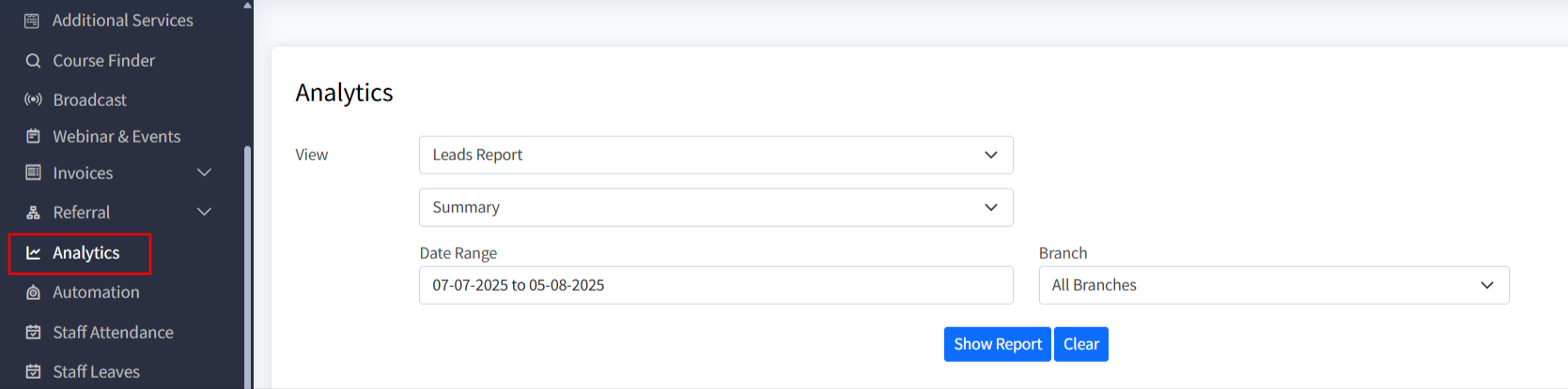 Learn how to access and filter reports inside the General > Analytics, including leads, students, applications, and more with advanced filtering and export options.
