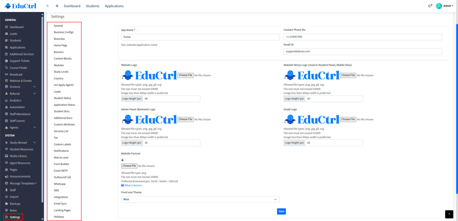 EduCtrl CRM offers a powerful and modular settings panel that allows administrators to configure branding, workflows, integrations, and automation. This article explains each configuration category available within the CRM settings.