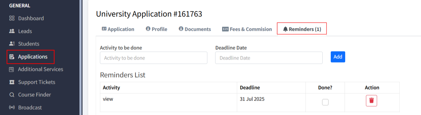 You can use reminders to follow up on pending tasks like “Upload Passport” or “Submit Application Fee.”