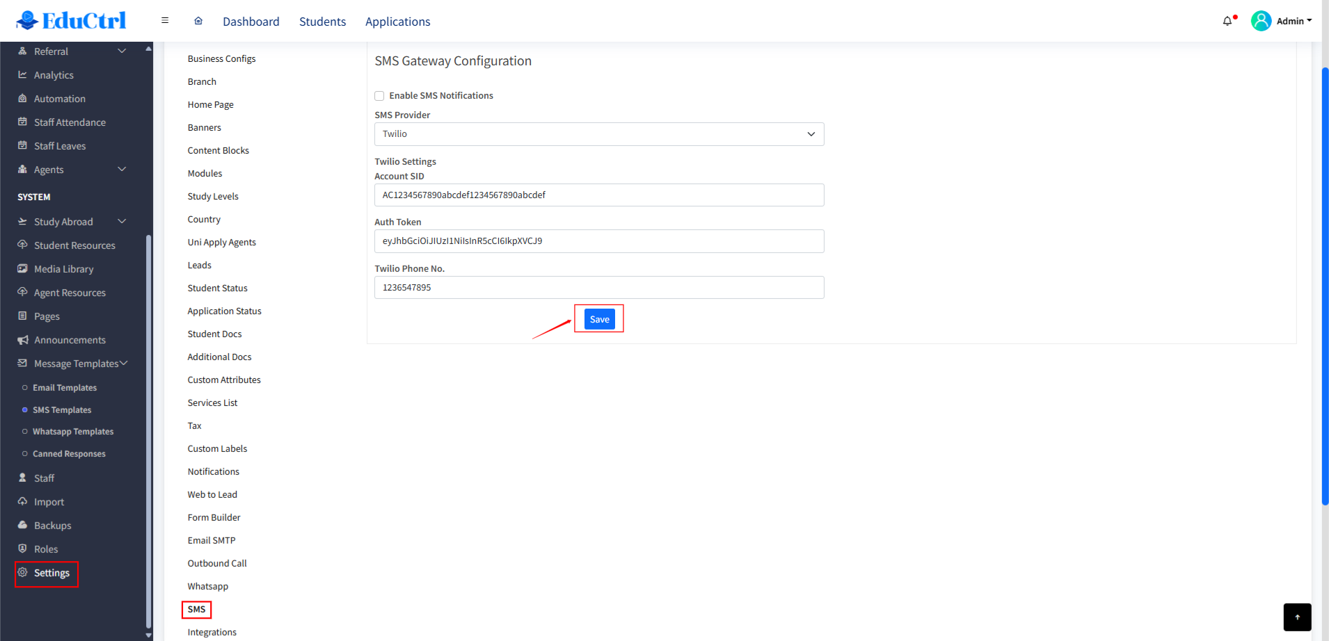 Select your SMS provider (Twilio, Textlocal, Gupshup, etc.) from the dropdown.