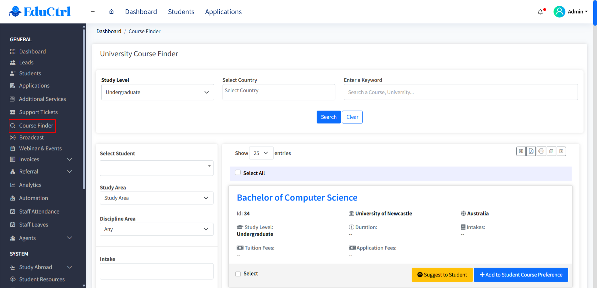 - Select the student you want to find courses for using the Select Student dropdown. The system uses the student’s study level and destination country preferences as default filters.
