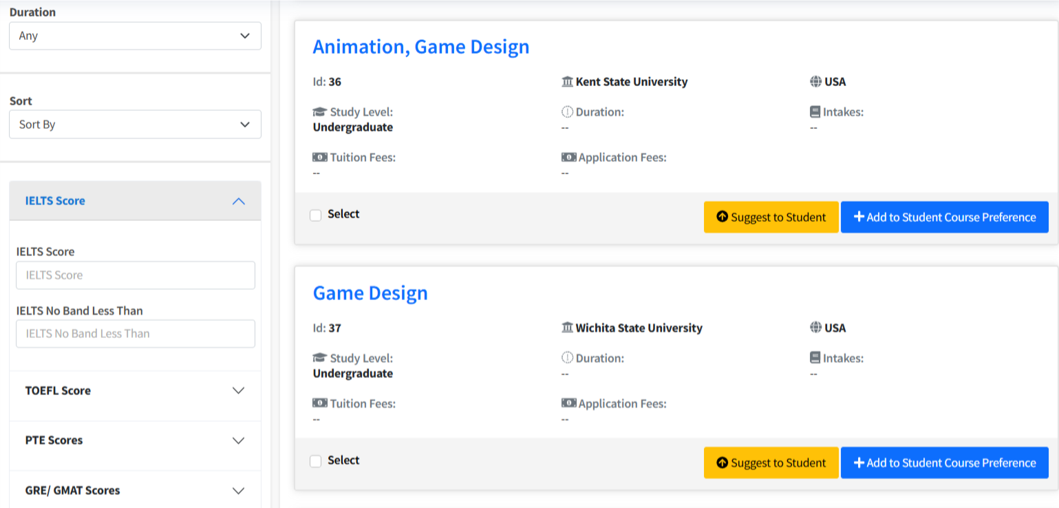- Sort by IELTS Score or Course Fee to tailor recommendations to student’s academic readiness or budget.